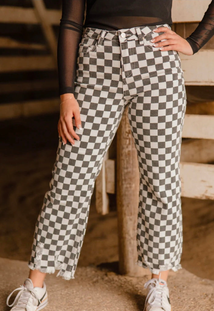 - Make a bold statement with the Fast Lane Jeans, featuring a striking black and white checkered pattern that catches every eye. Distressed details at the hems add an edgy, worn-in vibe, perfect for elevating your casual look. These jeans combine standout style with a unique twist, making them a must-have for anyone looking to turn heads effortlessly.