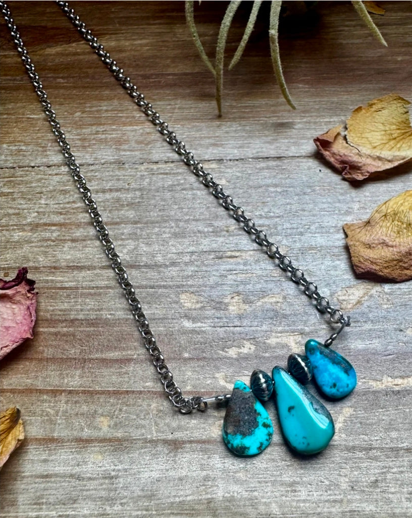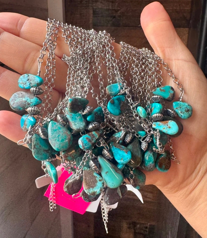 Material: Blue turquoise, sterling silver saucer pearls, the chain is SILVER PLATED