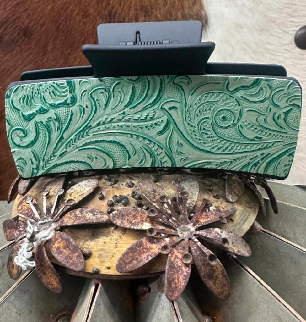 Hold your mane in style with this Cowgirl Tooled Hair Clip! Crafted from rich black material adorned with eye-catching turquoise tooled leather detailing, this claw clip brings Western flair to your everyday look. Perfect for securing your hair while adding a touch of rodeo-ready charm to your outfit. Whether you're channeling your inner cowgirl or just love a statement accessory, this clip delivers both function and personality.