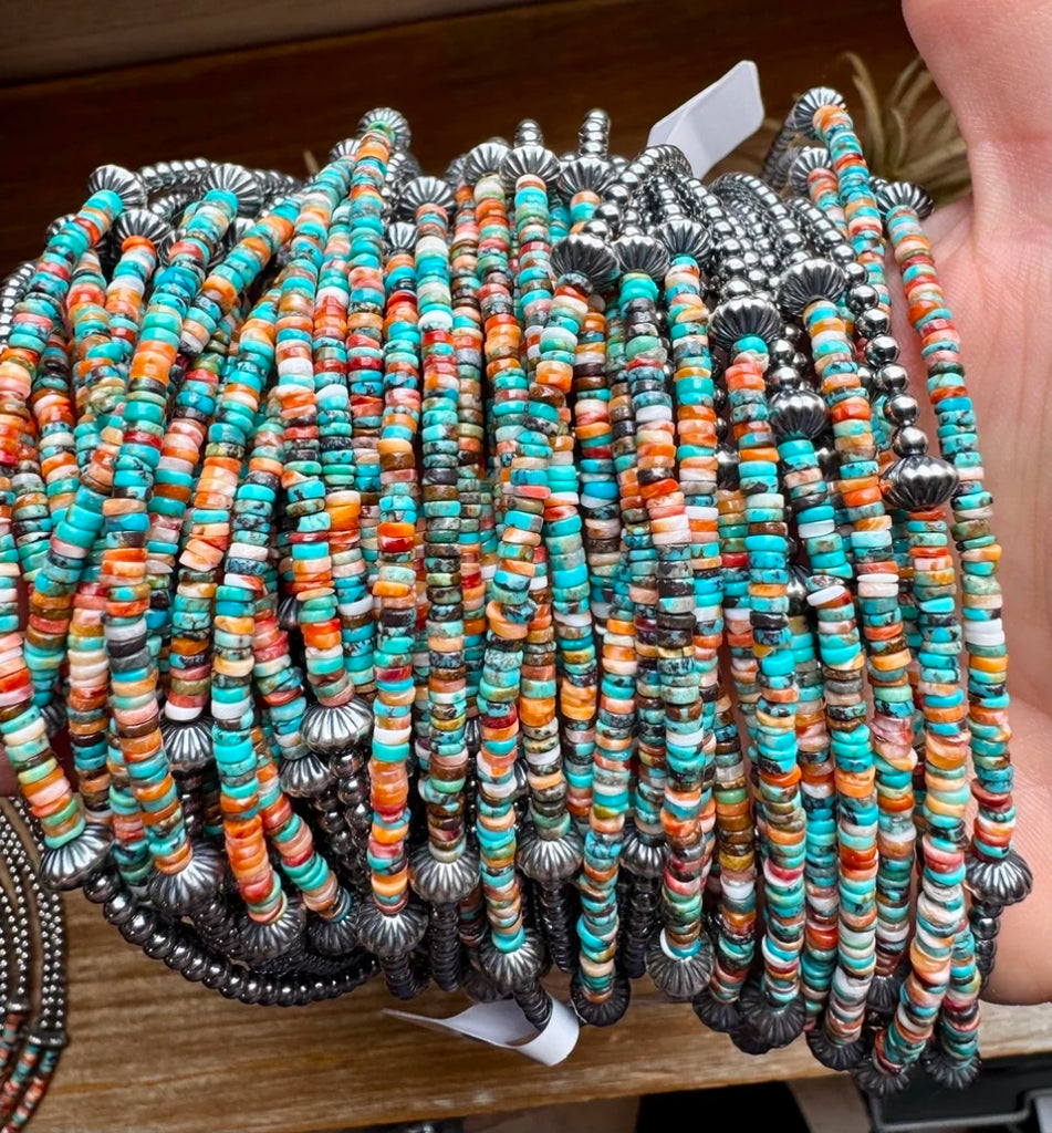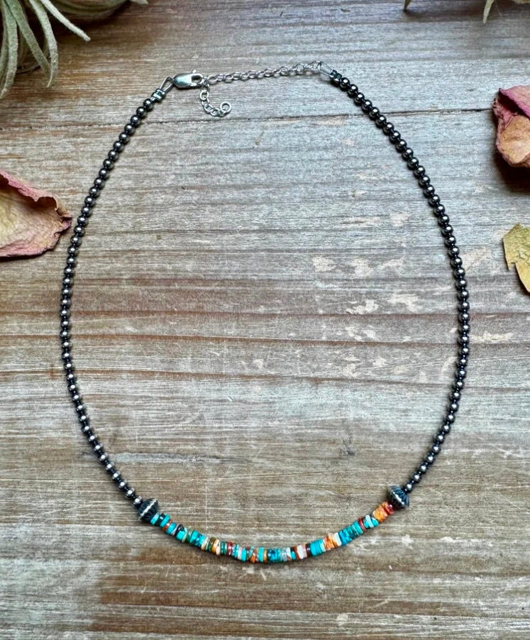 - This 14-inch choker is handmade by us in North Texas and features 3mm sterling silver pearls with sterling silver saucer accents and a bold center mix of heishi beads—this time with more turquoise as the star, accented with just the right amount of spiny oyster.